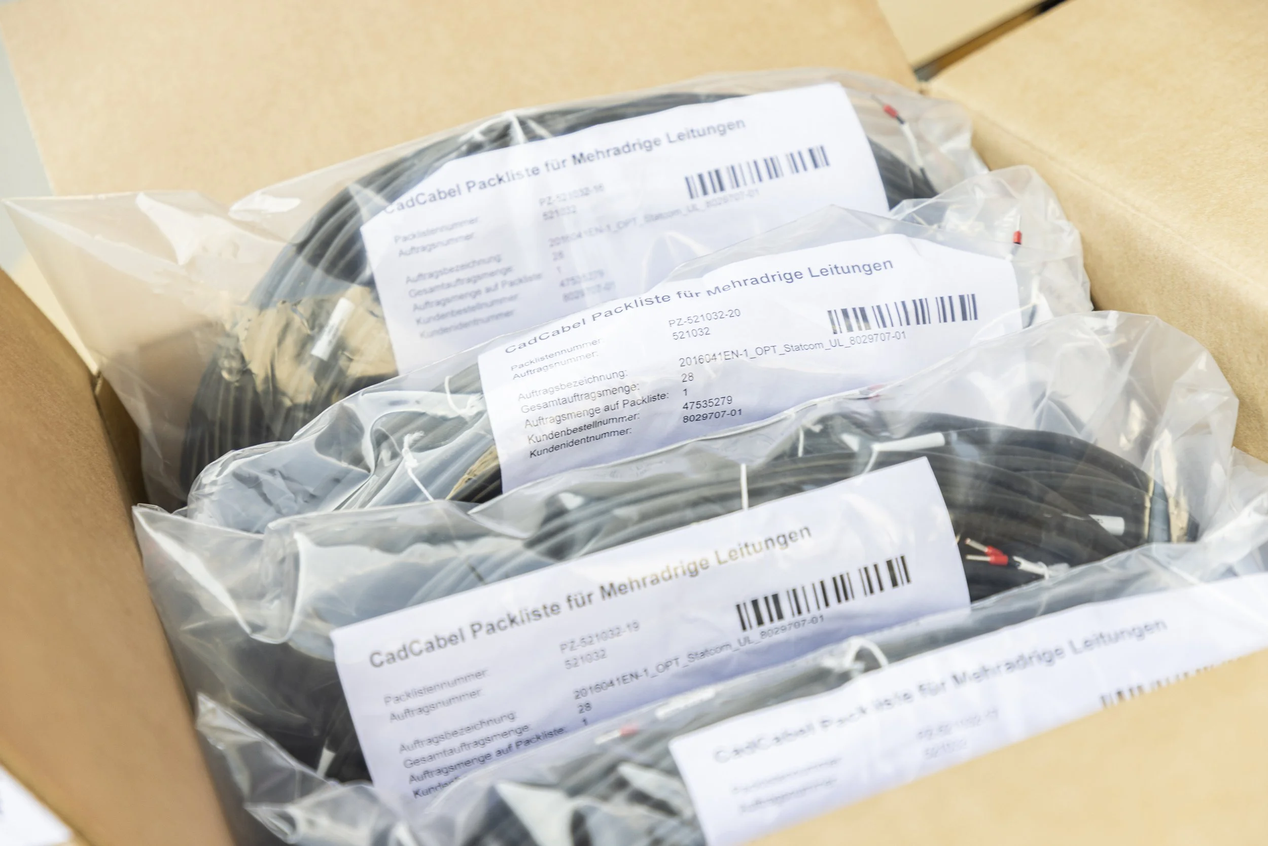 Die im Schaltschrank ermittelten Längen werden digital erfasst und an CADCABEL übermittelt. Auf dieser Basis entsteht ein vollständig konfektionierter Verdrahtungssatz mit exakt zugeschnittenen Leitungen und eindeutiger Kennzeichnung.